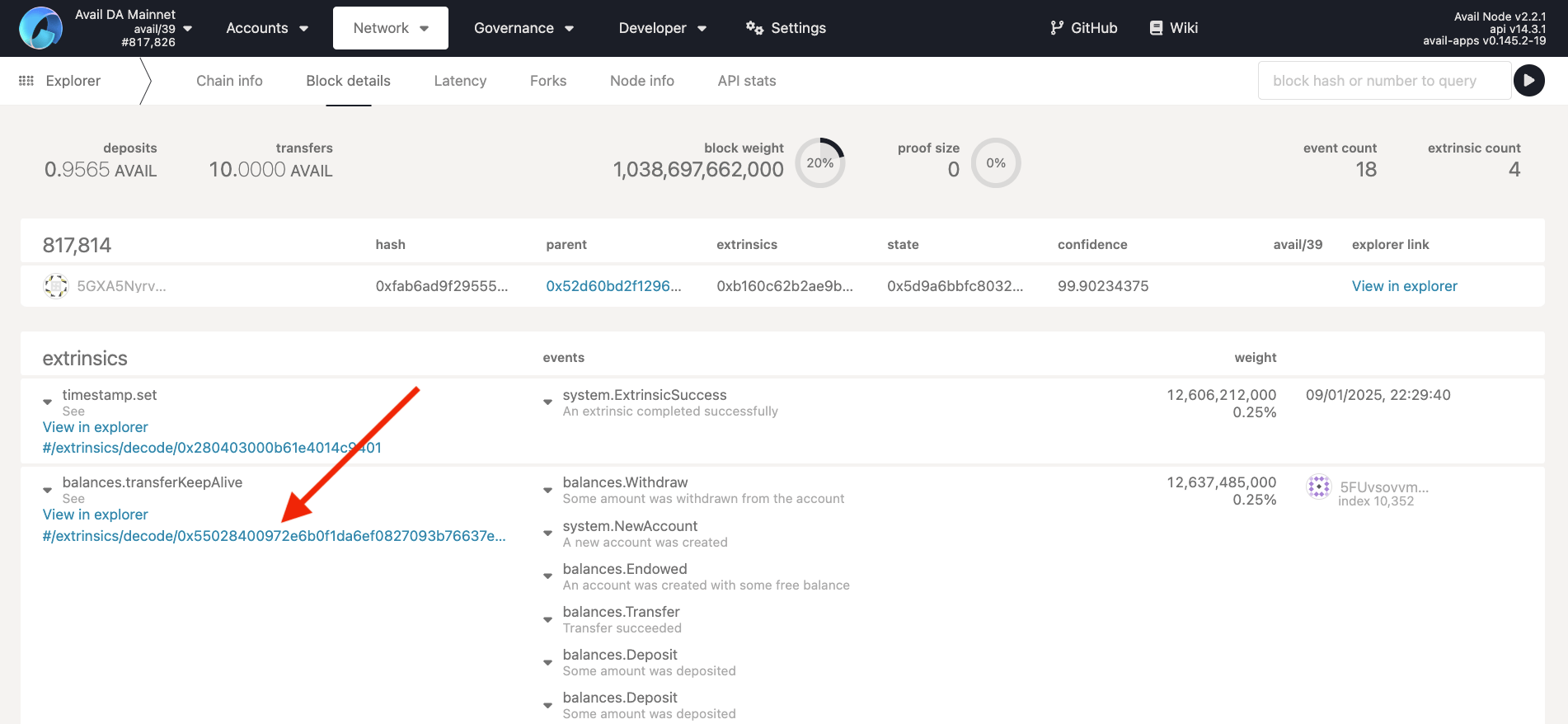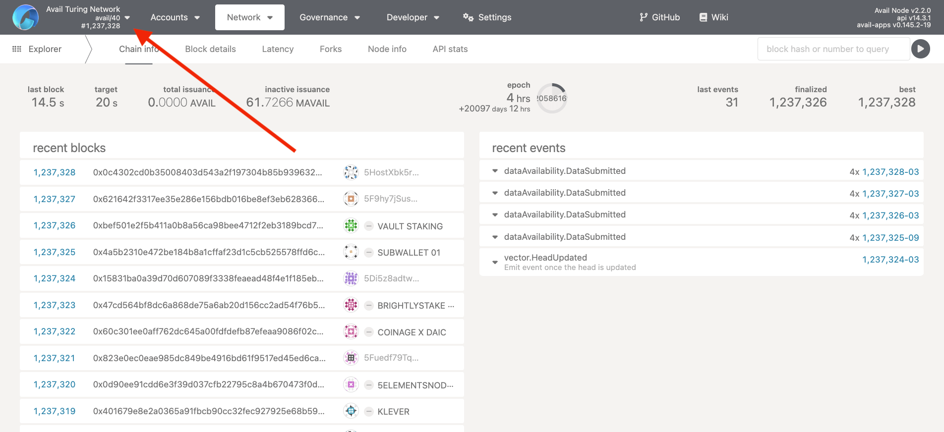 1. Depending on the network you are on, click on live networks -> Avail DA network, or test network -> Avail Turing testnet.