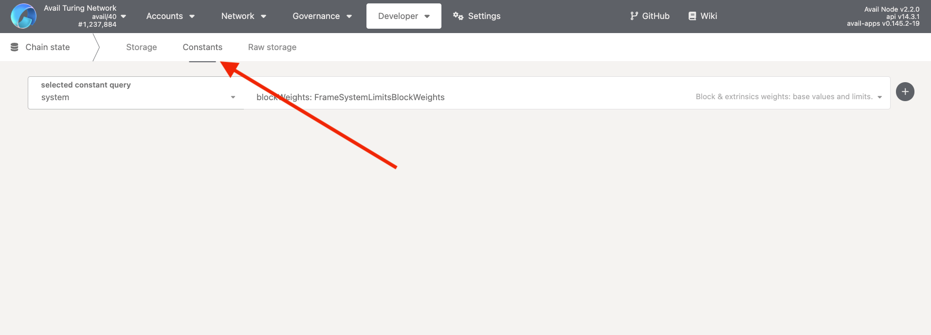 1. The AvailApps explorer allows you to query the current values of all of it’s runtime constants by going to the constants tab within Developer -> Chain State.