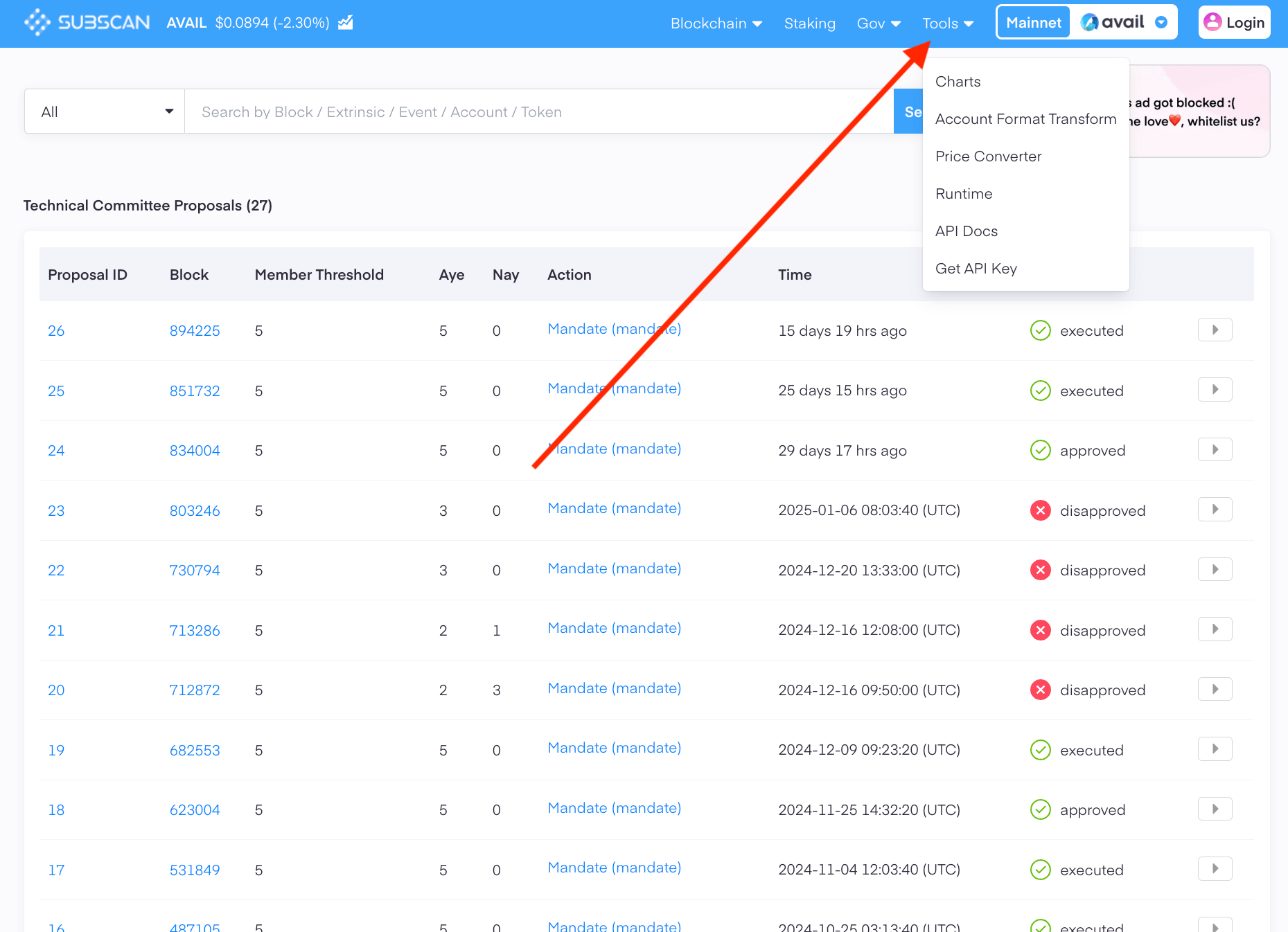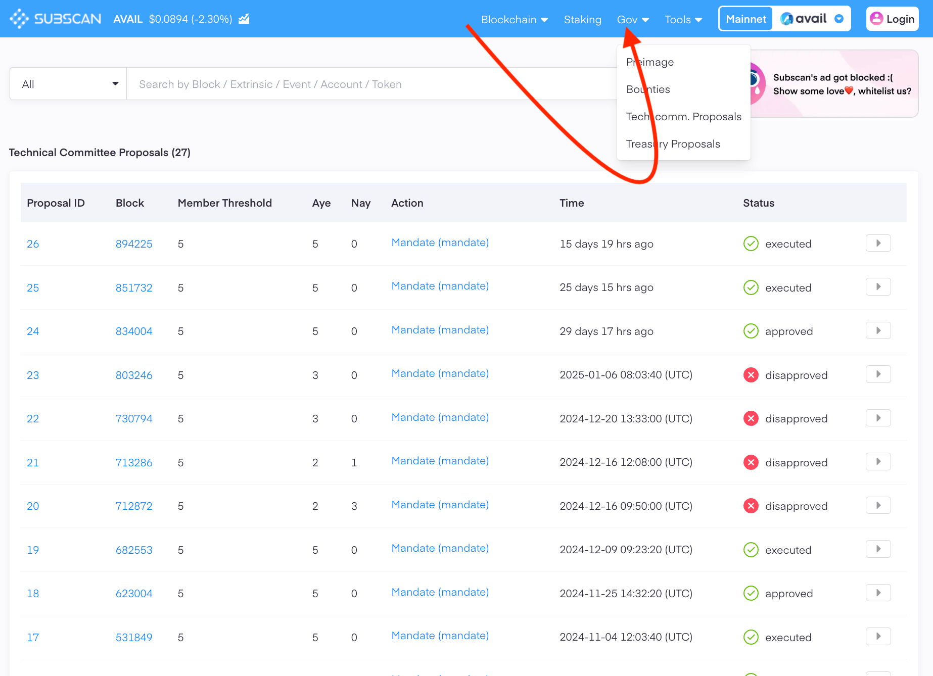 2. The Subscan explorer however, makes it possible to do so, since it queries from a dedicated indexer built on top of Avail to support this feature.