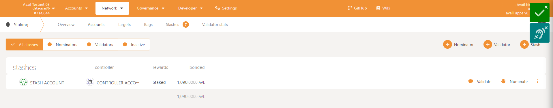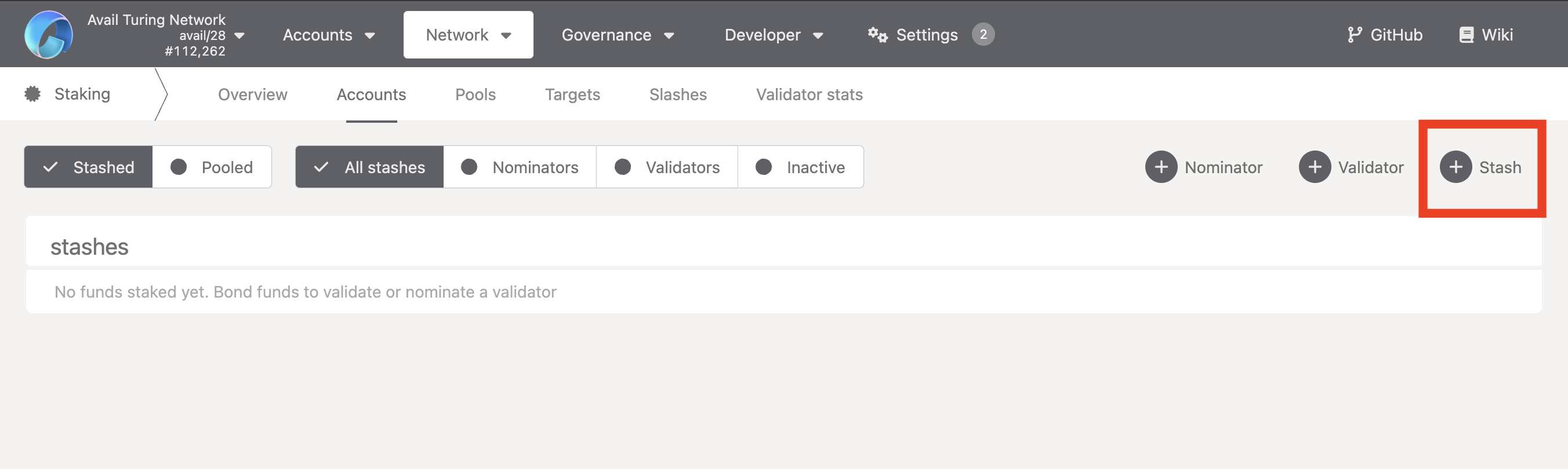 Before you can become an active validator, you need to bond your funds to your node. This involves creating two separate Avail accounts: a stash account for holding your funds and a controller account for managing staking actions.