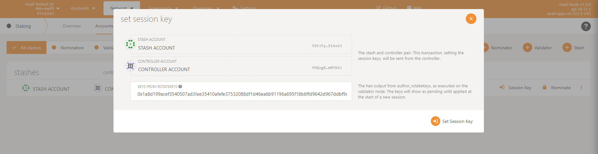 You must inform the network of your Session keys by signing and submitting the setKeys extrinsic. This action associates your validator with your Controller account.