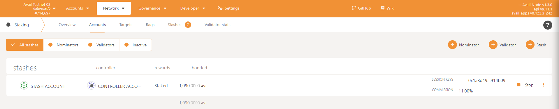 Don’t bond all your AVAIL tokens as you’ll need some for transaction fees. You can always bond more tokens later. Note: Withdrawing any bonded amount is subject to the duration of the unbonding period.