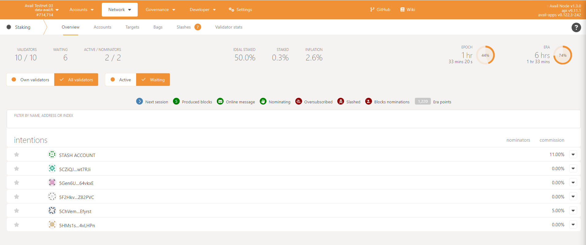 Your validator is now prepared to begin the validation process. If you wish to discontinue, you can click the stop icon. Please note that the Avail interface doesn’t automatically verify if your node is synchronized; you’ll need to confirm this manually. If your node has sufficient stake, the Avail blockchain will likely select it in the next epoch or two.